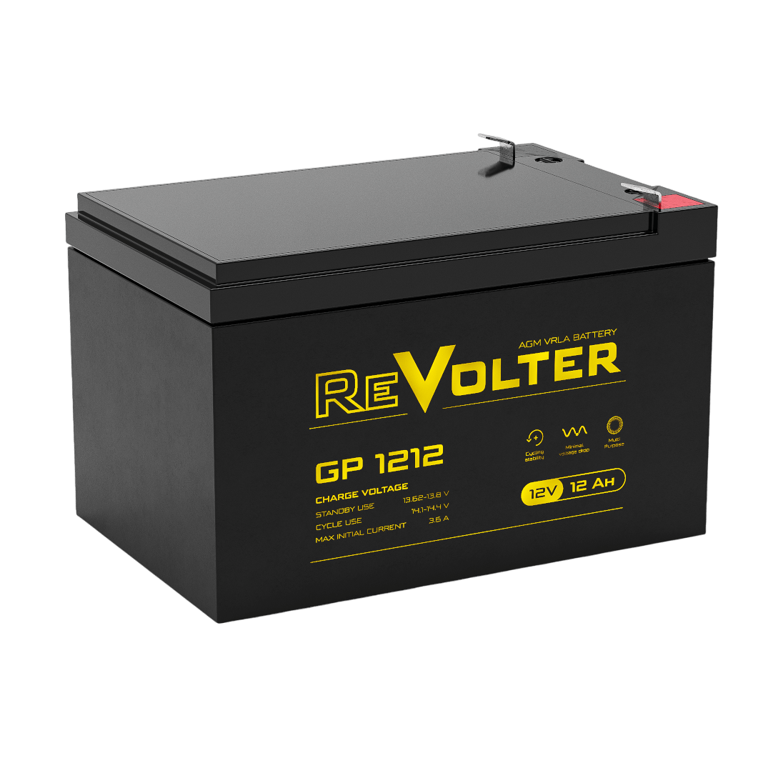 Свинцово-кислотные аккумуляторы REVOLTER GP являются герметизированными, необслуживаемыми с системой рекомбинации газов (VRLA). Изготавливаются по технологии AGM (Absorbent Glass Mat — электролит, абсорбированный в стекловолоконном сепараторе). Серия GP является универсальной и рекомендована для использования как в буферном, так и в циклическом режимах работы − в различных переносных приборах, а также в стационарных системах с резервным питанием.