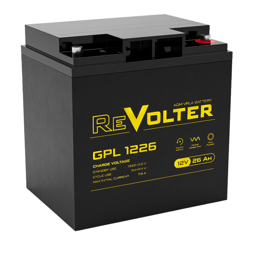 Свинцово-кислотные аккумуляторы REVOLTER GP являются герметизированными, необслуживаемыми с системой рекомбинации газов (VRLA). Изготавливаются по технологии AGM (Absorbent Glass Mat — электролит, абсорбированный в стекловолоконном сепараторе). Серия GP является универсальной и рекомендована для использования как в буферном, так и в циклическом режимах работы − в различных переносных приборах, а также в стационарных системах с резервным питанием.